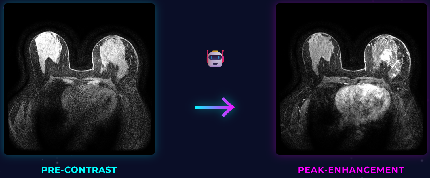 More specifically, each submitted method should take a pre-contrast breast MRI slice as input and produce a synthetic post-contrast image corresponding to the peak-enhancement phase. The challenge is designed not only to assess image similarity, but also to evaluate whether synthesized images preserve clinically meaningful tumor information.